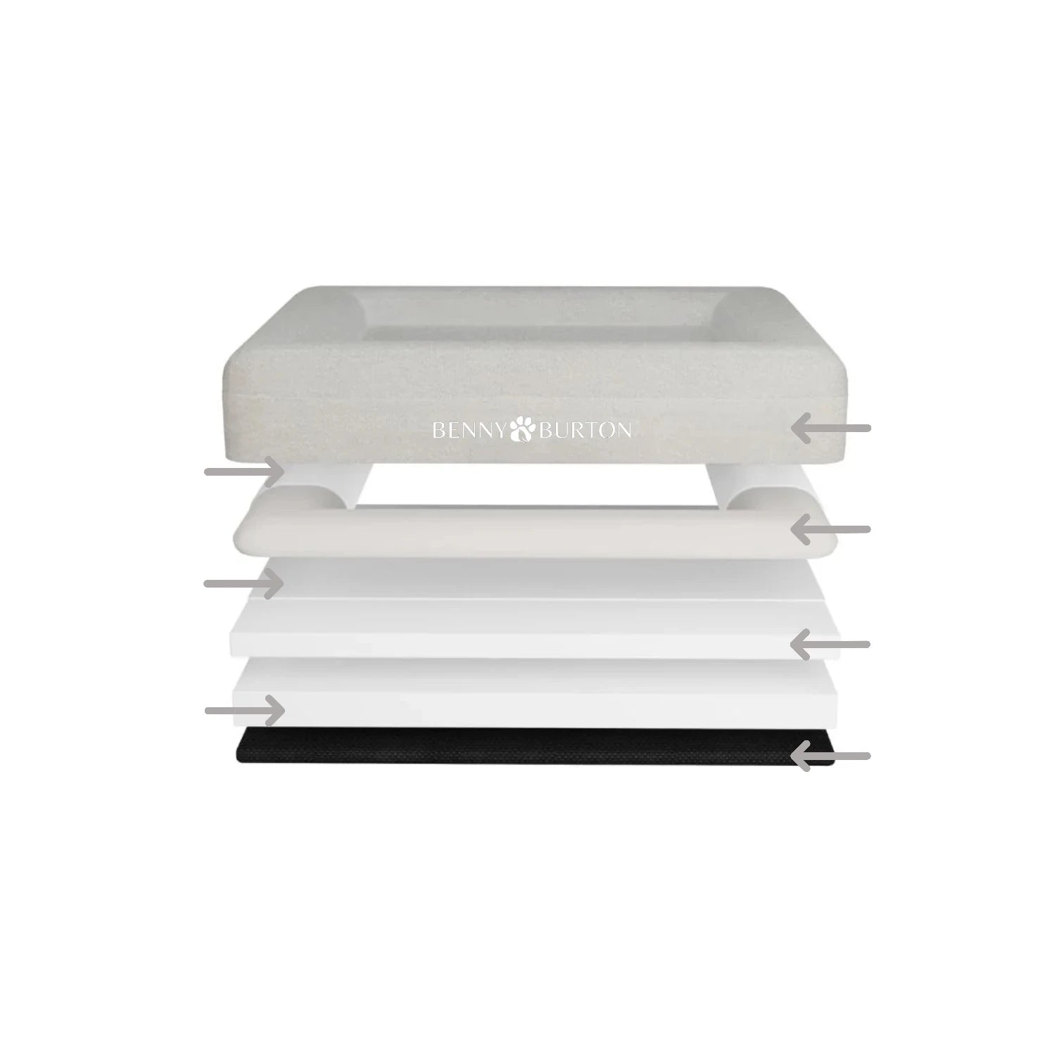Wir benutzen zu 100% hochwertigen Viskoschaum geschützt in einer abnehmbaren Hülle. Die selbe Qualität wie für Menschen. Keine Flocken! Auch nicht in den Rändern.